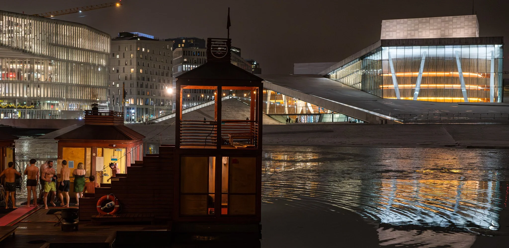 A discordant sight greeted us - sauna visitors in swimsuits plunged into the frozen Oslo Fjord .